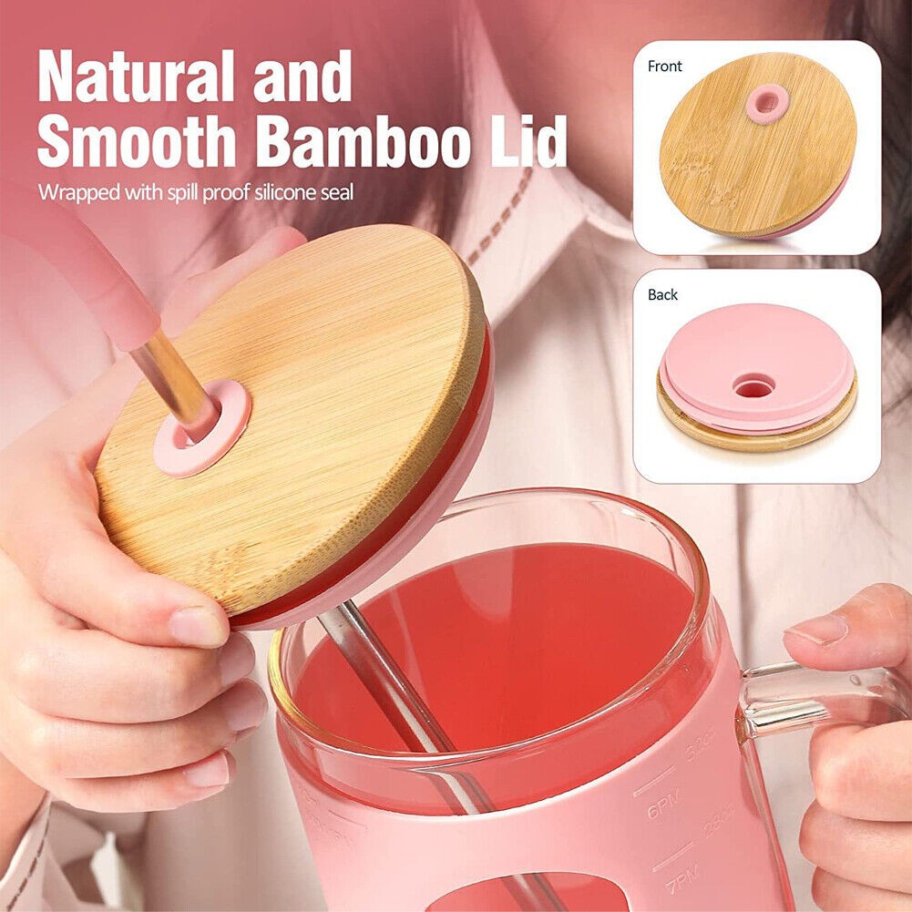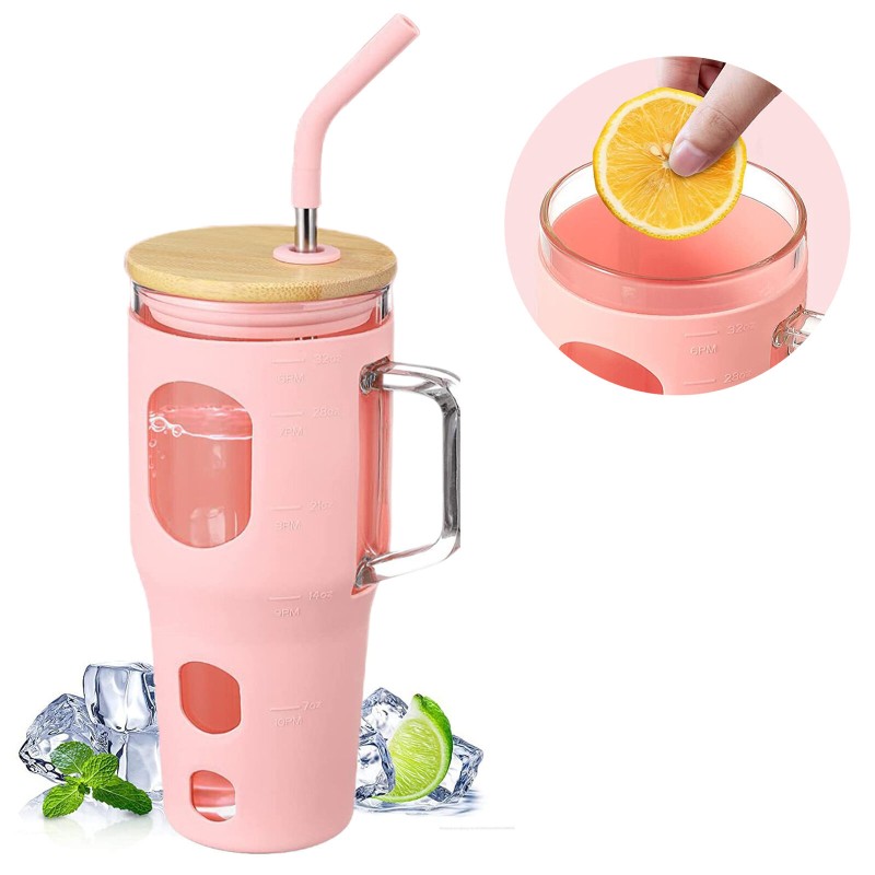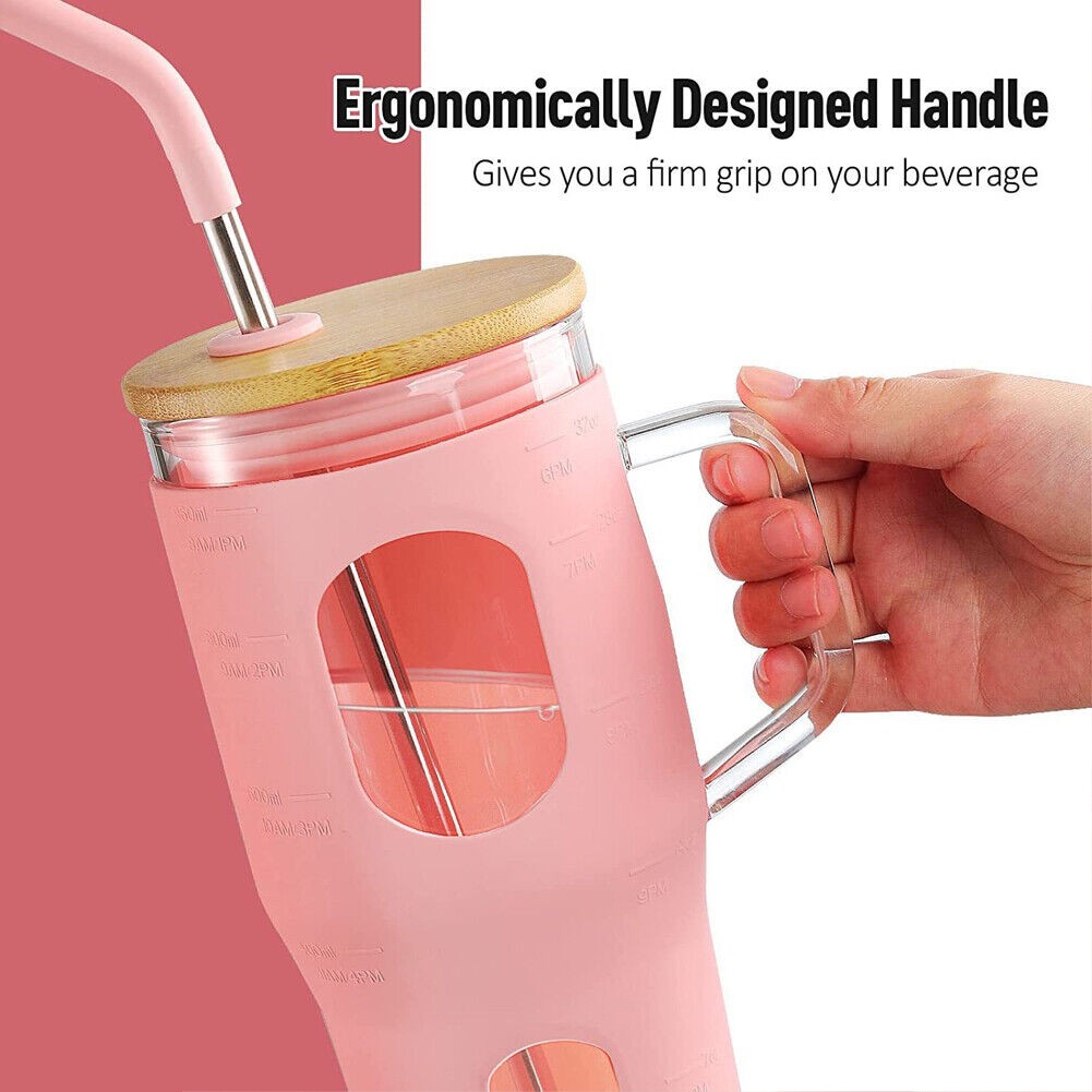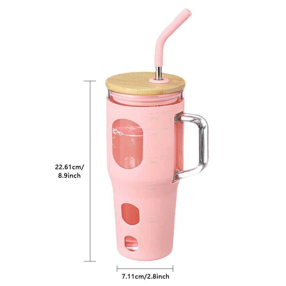 32oz With Straw Glass Tumbler Silicone Sleeve Bamboo Lid Reusable Drinking Mug