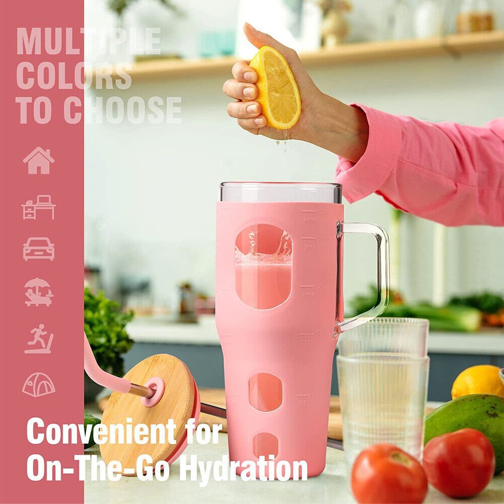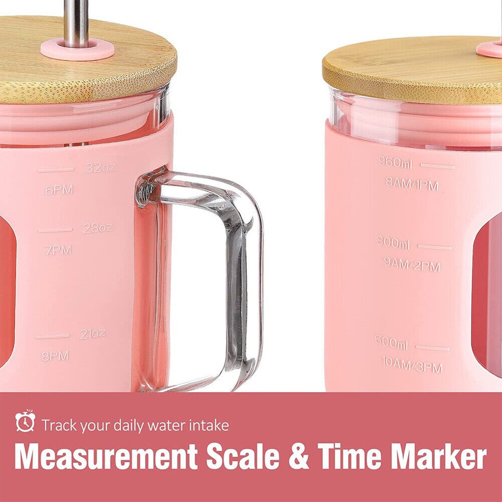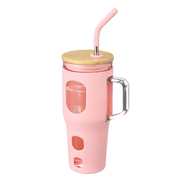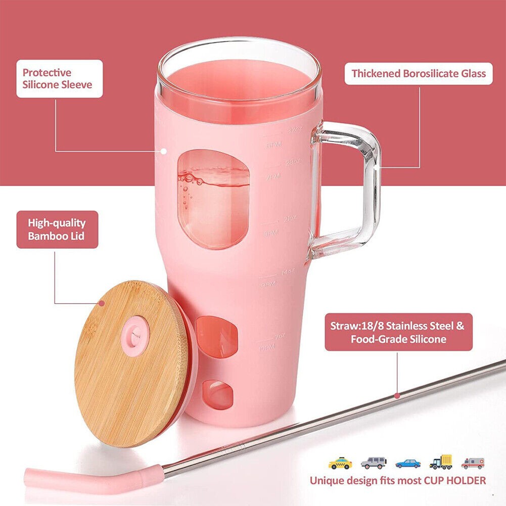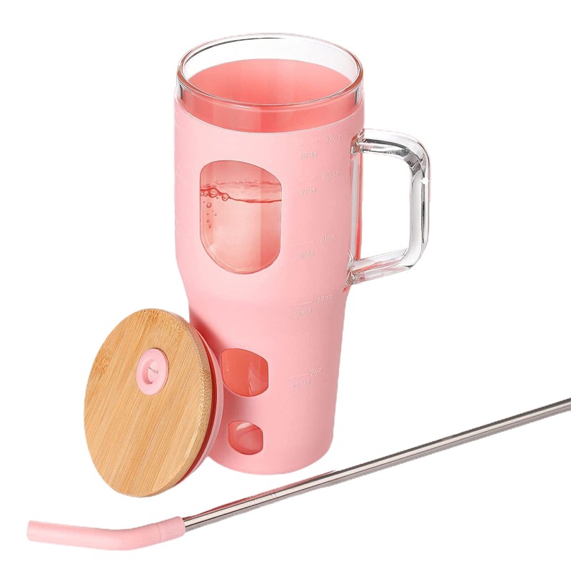 32oz With Straw Glass Tumbler Silicone Sleeve Bamboo Lid Reusable Drinking Mug