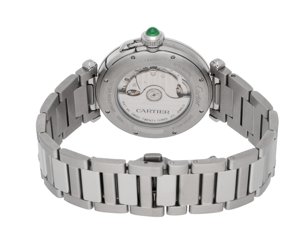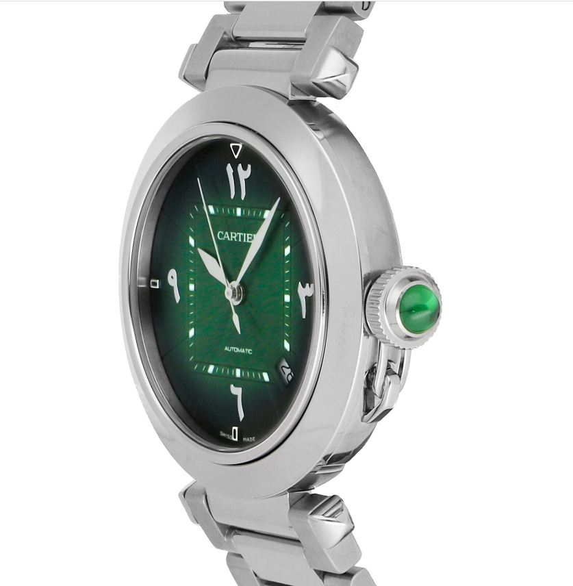 Pre-Owned Cartier Pasha (WSPA0022) self - winding automatic watch, features a 41mm stainless steel case surrounding a green "arabic" dial on a stainless steel bracelet with folding buckle. Functions include hours, minutes, seconds and date. This watch comes complete with the original box and papers. Time remaining on the factory warranty!
