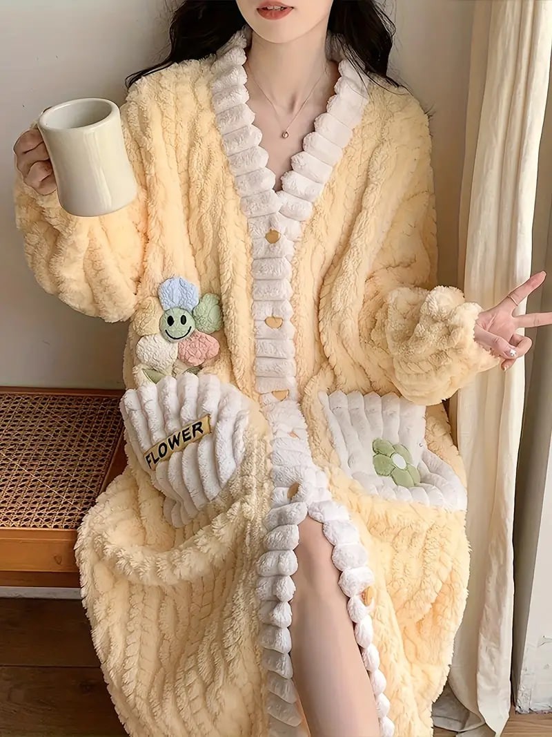 Flower Decor Fuzzy Night Robe, Cute Long Sleeve V Neck Robe With Pockets, Women's Sleepwear