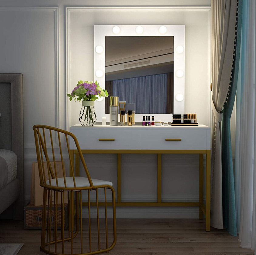• STYLISH YET FUNCTIONAL: This elegant lighted vanity table with mirror and 9 Hollywood style LED Light Bulbs will glamorize your bedroom or changing area that you've always dreamed of owning. Get the full picture in the large mirror with soft and non-dazzling light to prep for the coming day or primp for a night out.